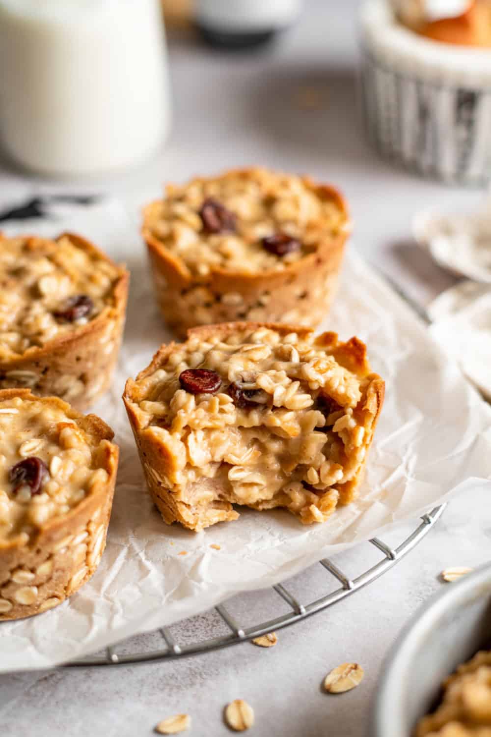 Want to nail these oatmeal cups every time? First, don’t overmix the batter – a few lumps are totally fine. Make sure you distribute the liquid evenly when filling the muffin cups, so none end up dry.