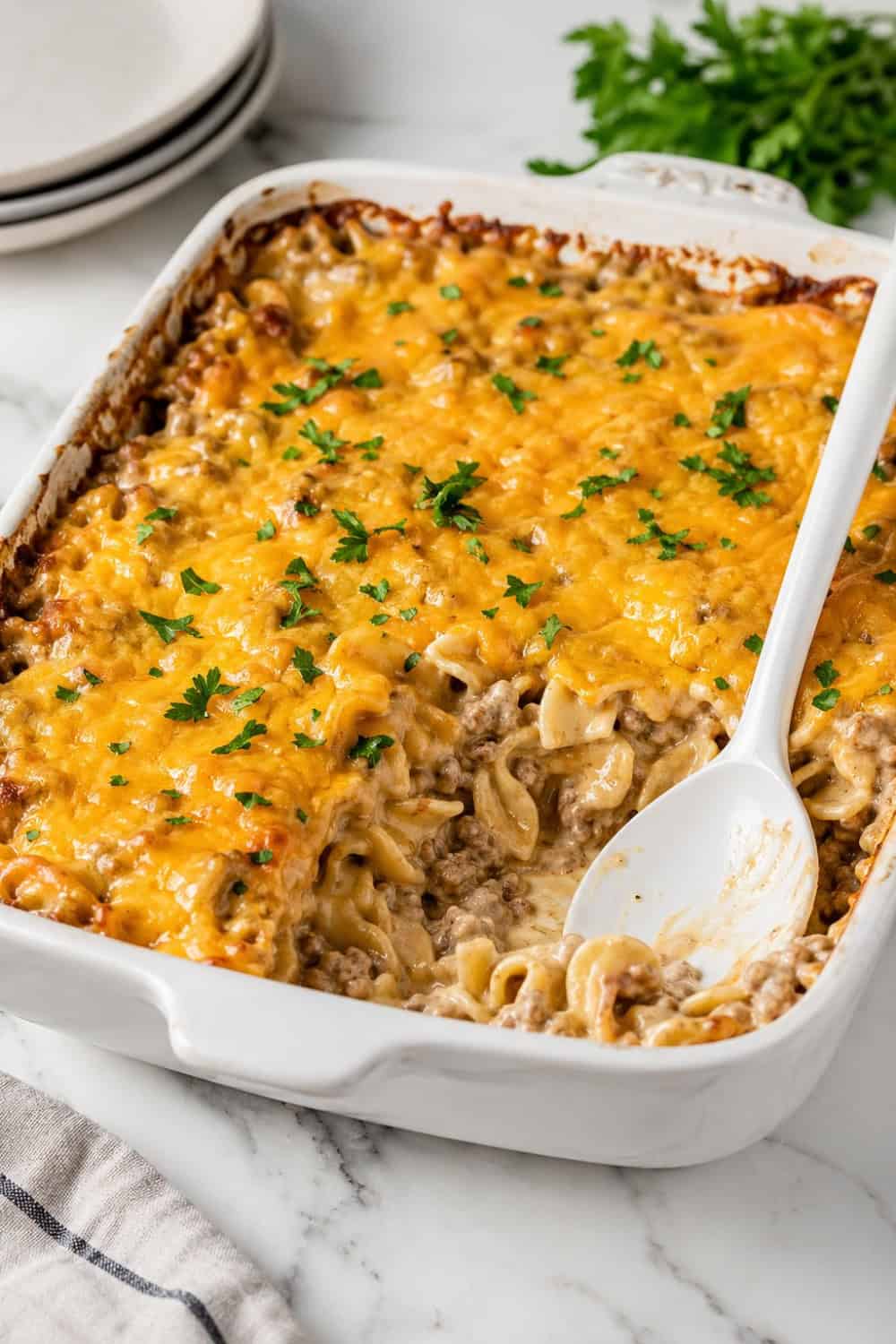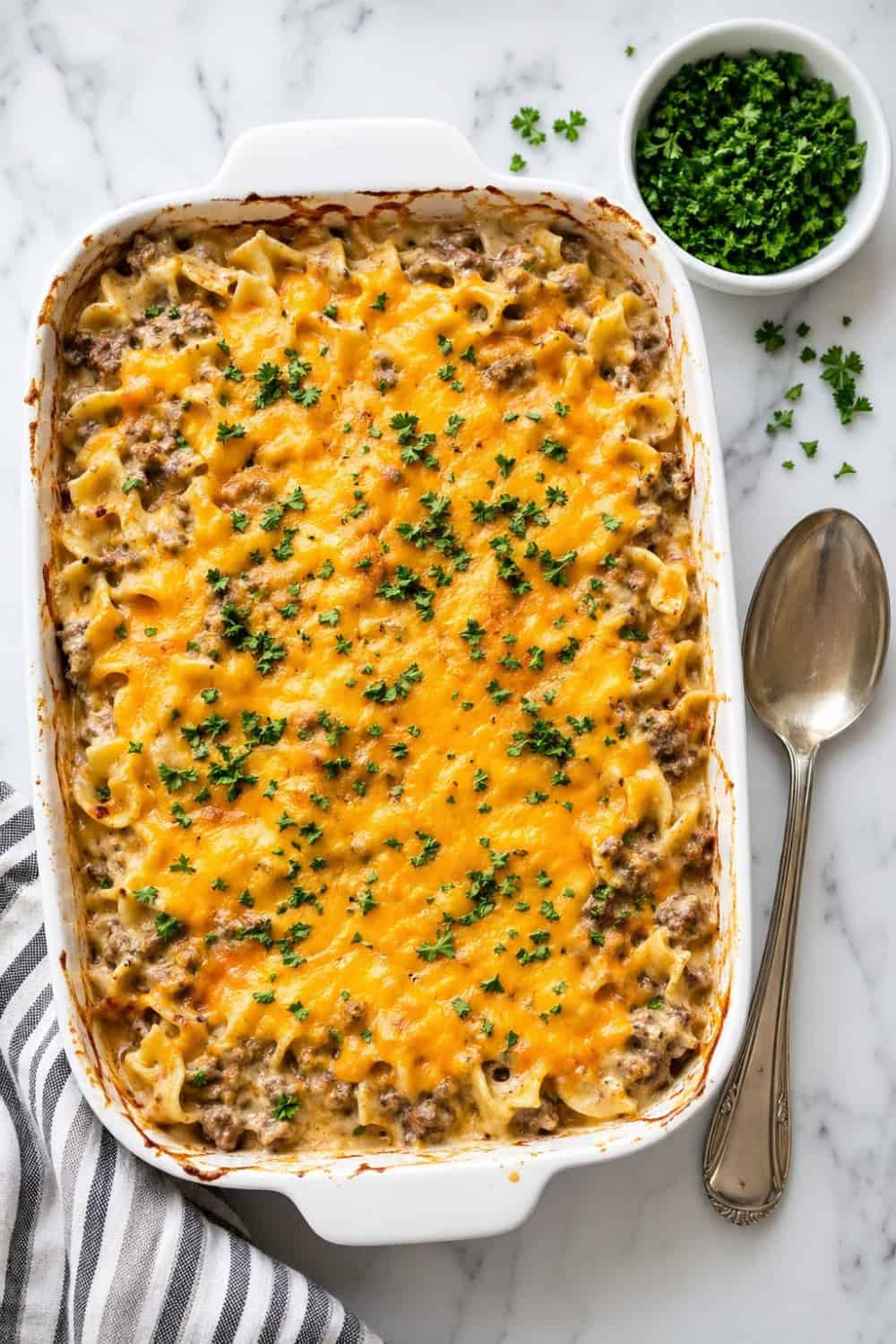 Undercook your noodles slightly before baking. Since they’ll continue cooking in the oven, starting them a little firm keeps them from turning mushy by the time the casserole is done. Always drain your ground beef well — excess grease will make the sauce greasy rather than creamy.