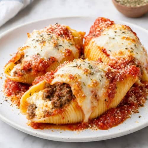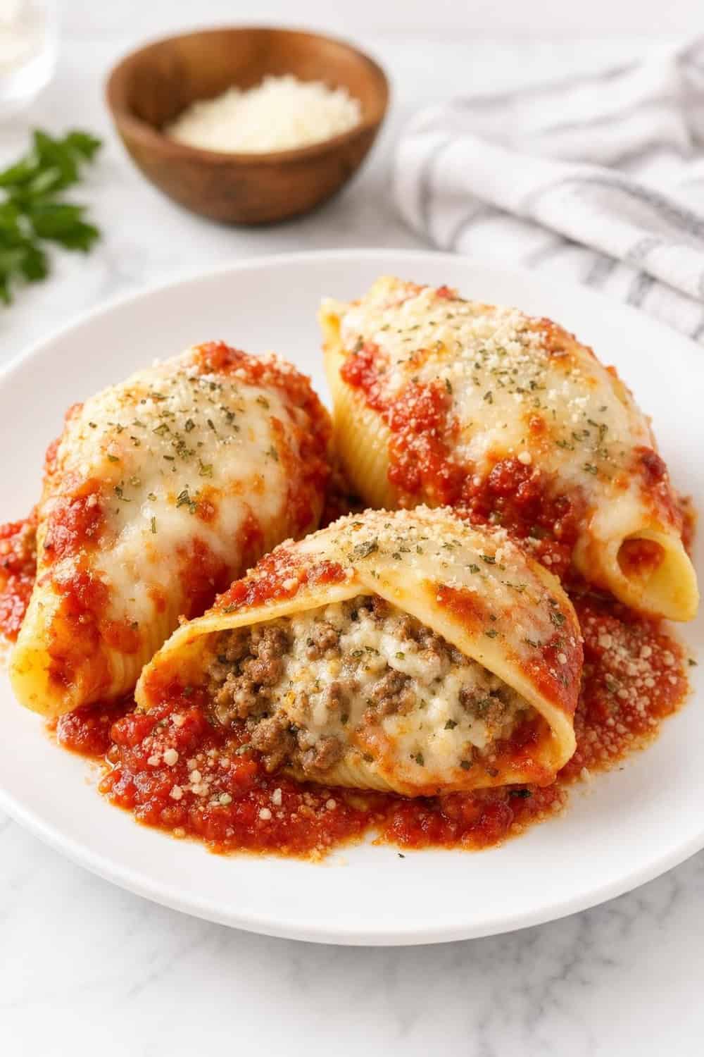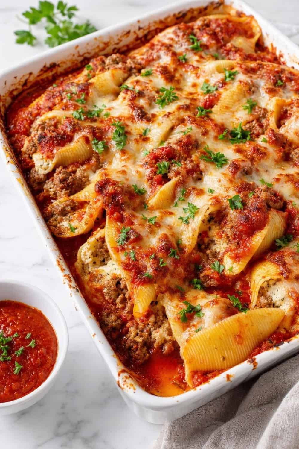 Each shell gets packed with a rich, savory filling of seasoned ground beef, fluffy ricotta, and generous handfuls of mozzarella, then gets smothered in marinara and baked until the cheese on top turns golden and bubbly.