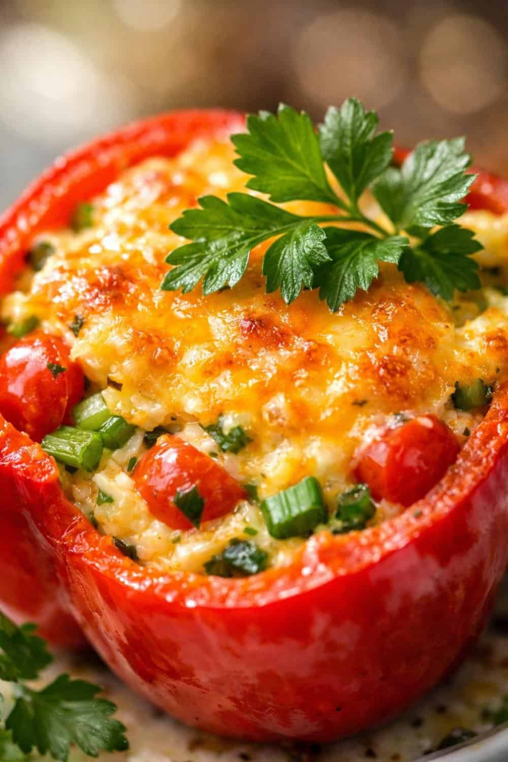 Perfectly baked bell peppers cradle a fluffy egg mixture studded with fresh vegetables and melted cheese.