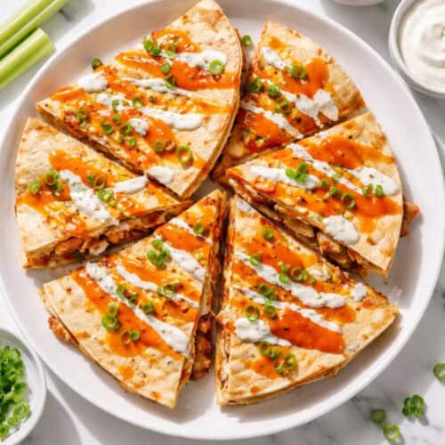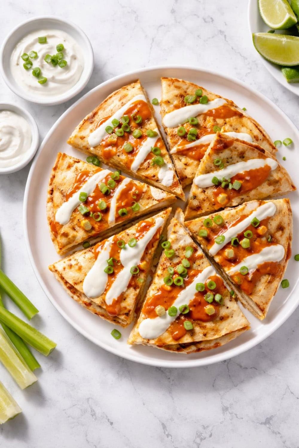 These quesadillas pair great with a cold, creamy coleslaw on the side to balance the heat. A simple avocado or guacamole dip adds a cool, rich contrast to the spicy buffalo flavors. You could also serve them alongside a crisp romaine salad tossed with a light buttermilk ranch dressing.