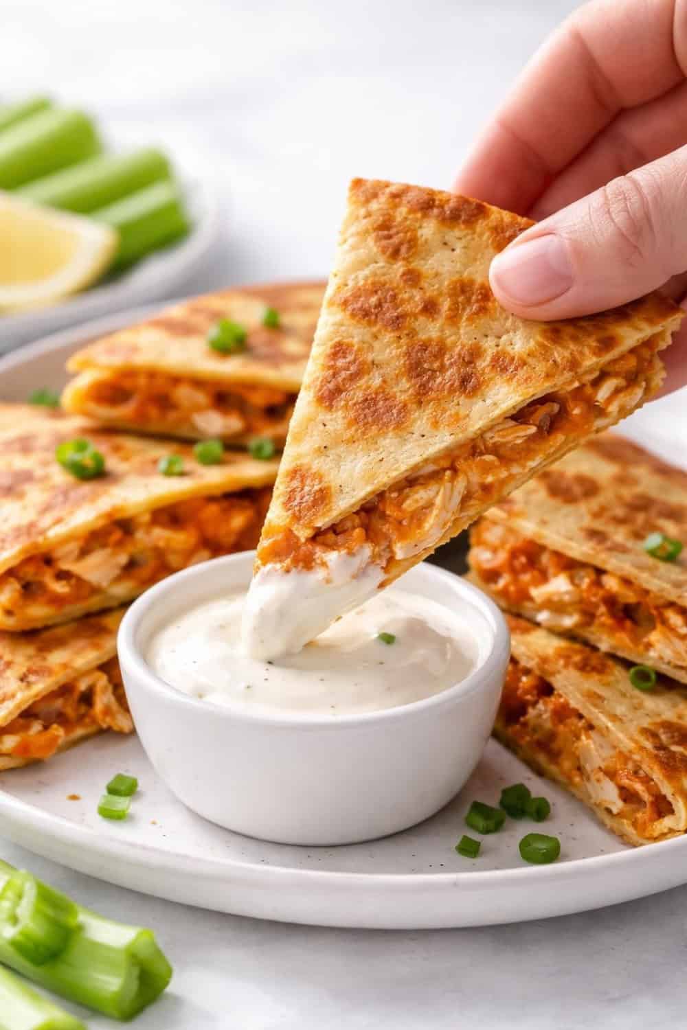 Loaded with saucy buffalo chicken and two kinds of melted cheese tucked inside a golden, buttery tortilla, every single bite delivers heat, richness, and serious satisfaction.
