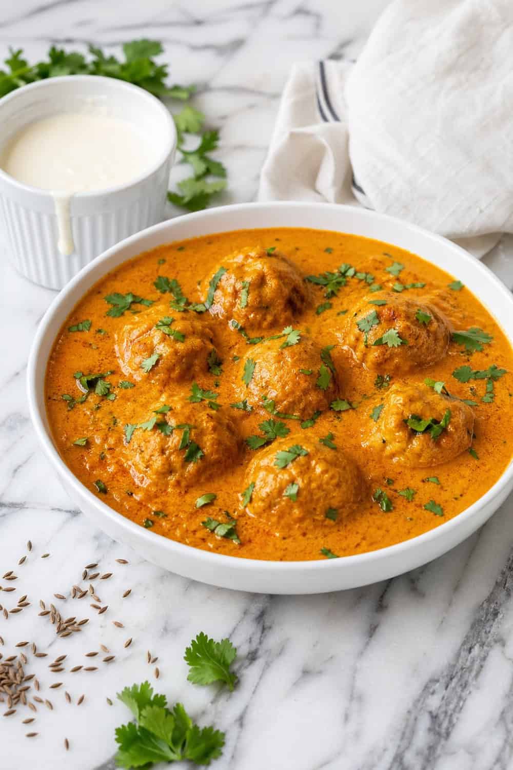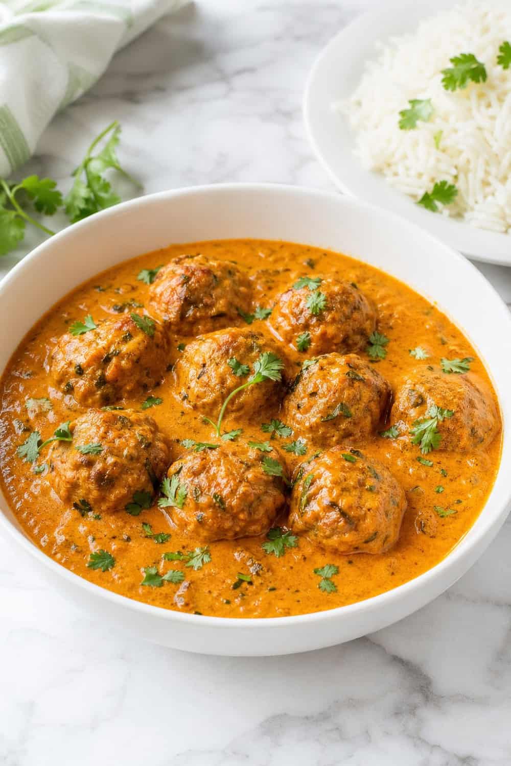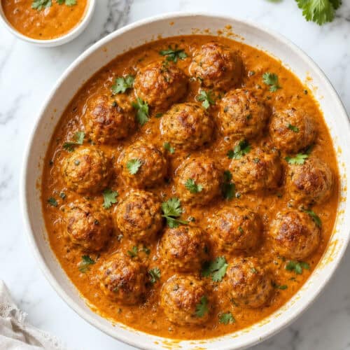 Fragrant ground chicken meatballs, rolled with cumin, coriander, and garam masala, get seared until golden before nestling into a luscious tomato-cream sauce that’s rich, deeply spiced, and impossible to stop eating.