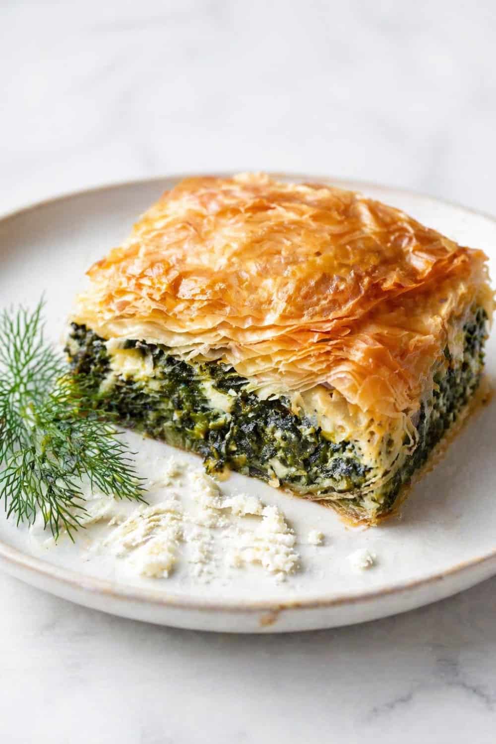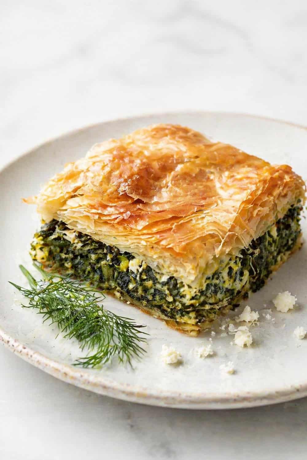 Leftover spanakopita stores well in an airtight container in the refrigerator for up to four days. For reheating, the oven is best — place slices on a baking sheet at 350°F for about 10–12 minutes to bring the phyllo back to its crispy glory.