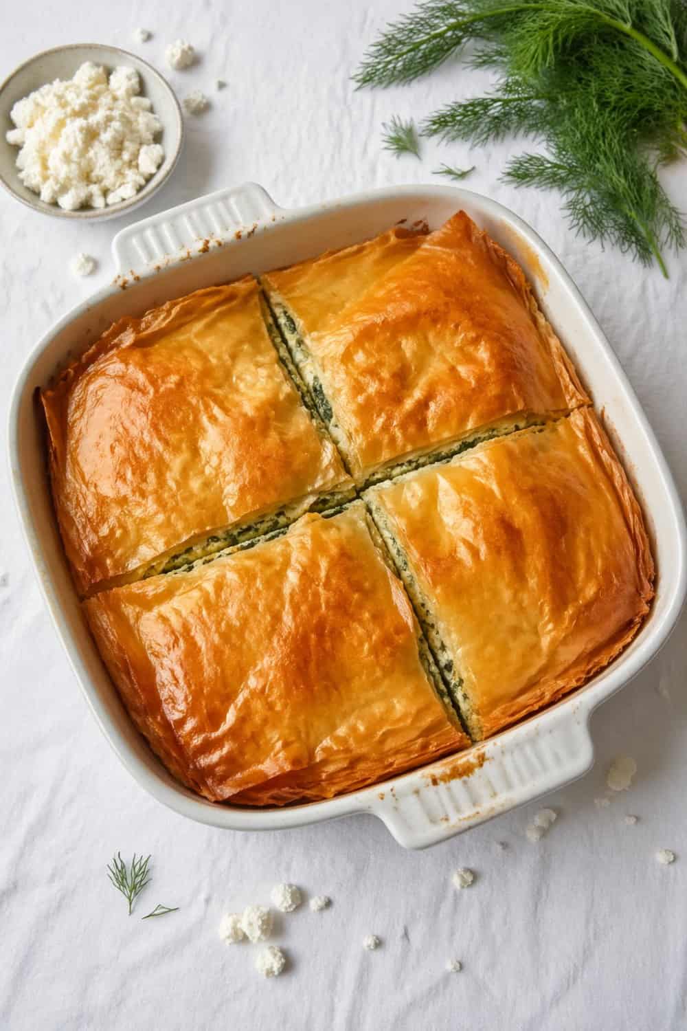 You can make the entire filling up to two days ahead and store it covered in the refrigerator — in fact, the flavors deepen nicely overnight. The assembled, unbaked spanakopita can be wrapped tightly and refrigerated for up to 24 hours before baking; just add five extra minutes to the bake time if going straight from cold.