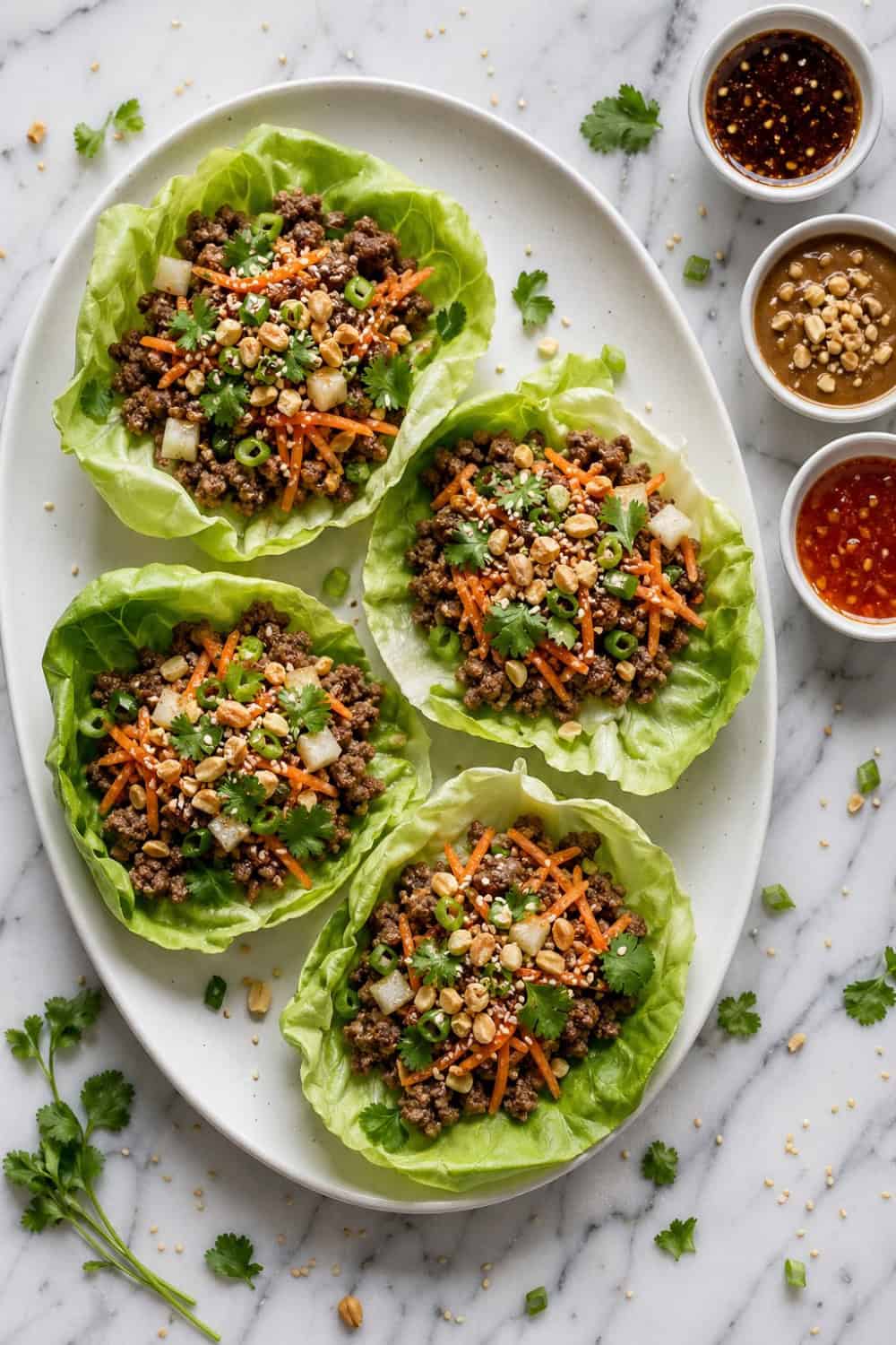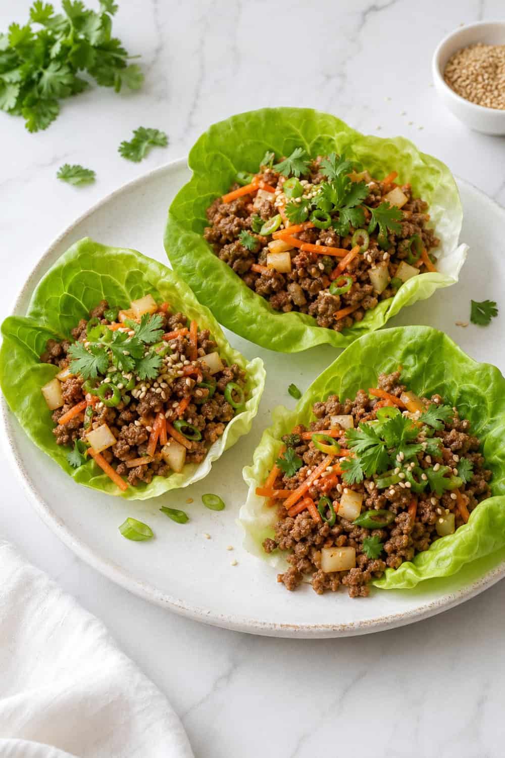 - Assemble your wraps. Spoon the beef mixture into individual butter lettuce cups, add your favorite toppings, and serve immediately.