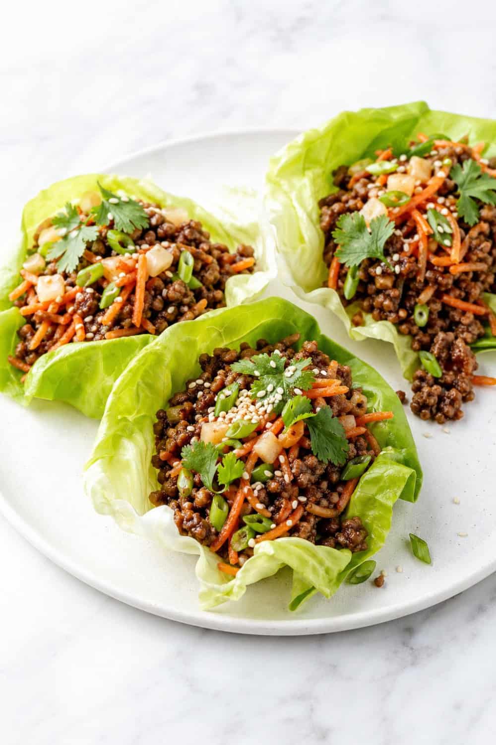 The filling also freezes really well for up to 3 months; just thaw overnight in the fridge before reheating. Fresh lettuce cups don’t hold up well after being assembled, so always build your wraps right before eating.