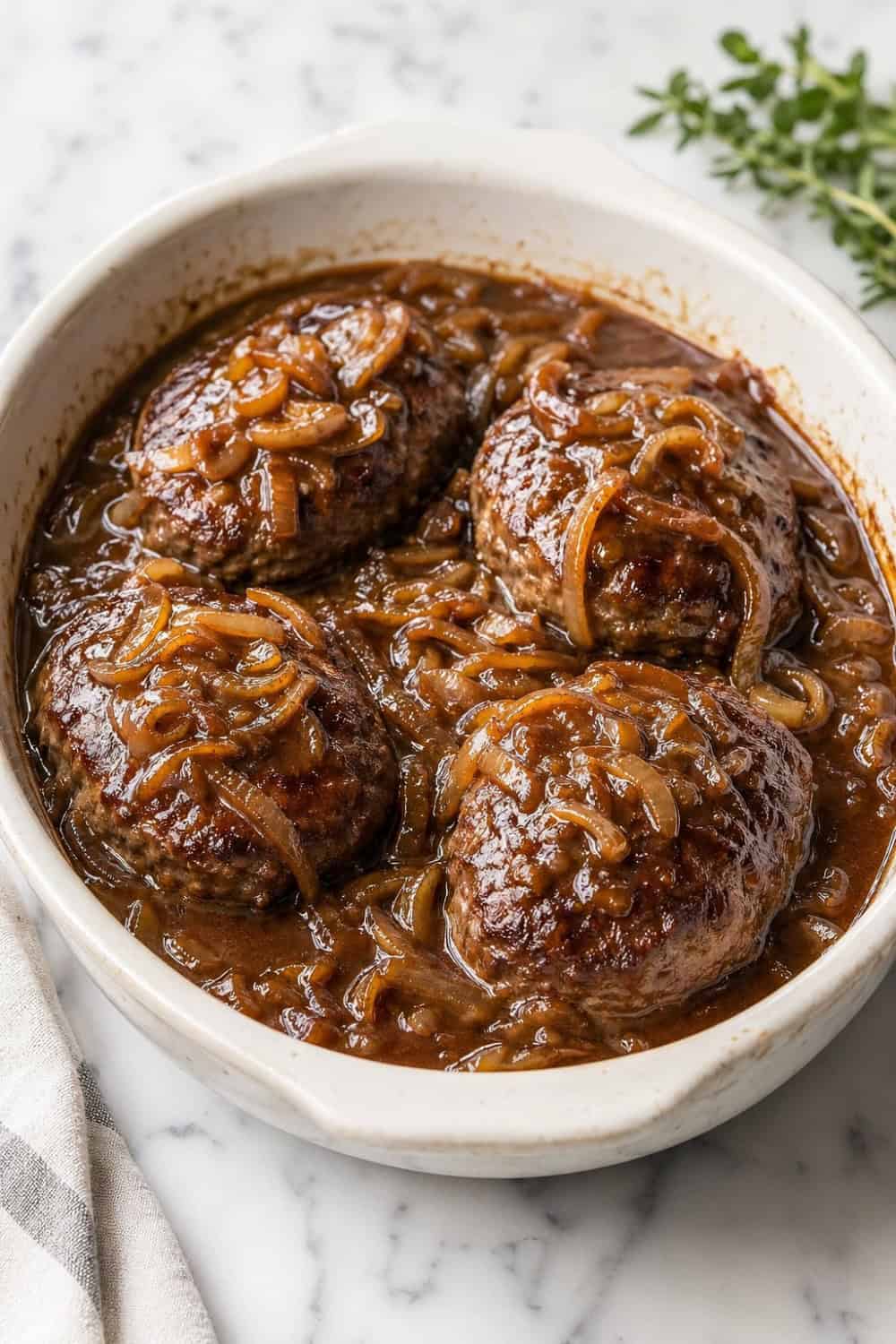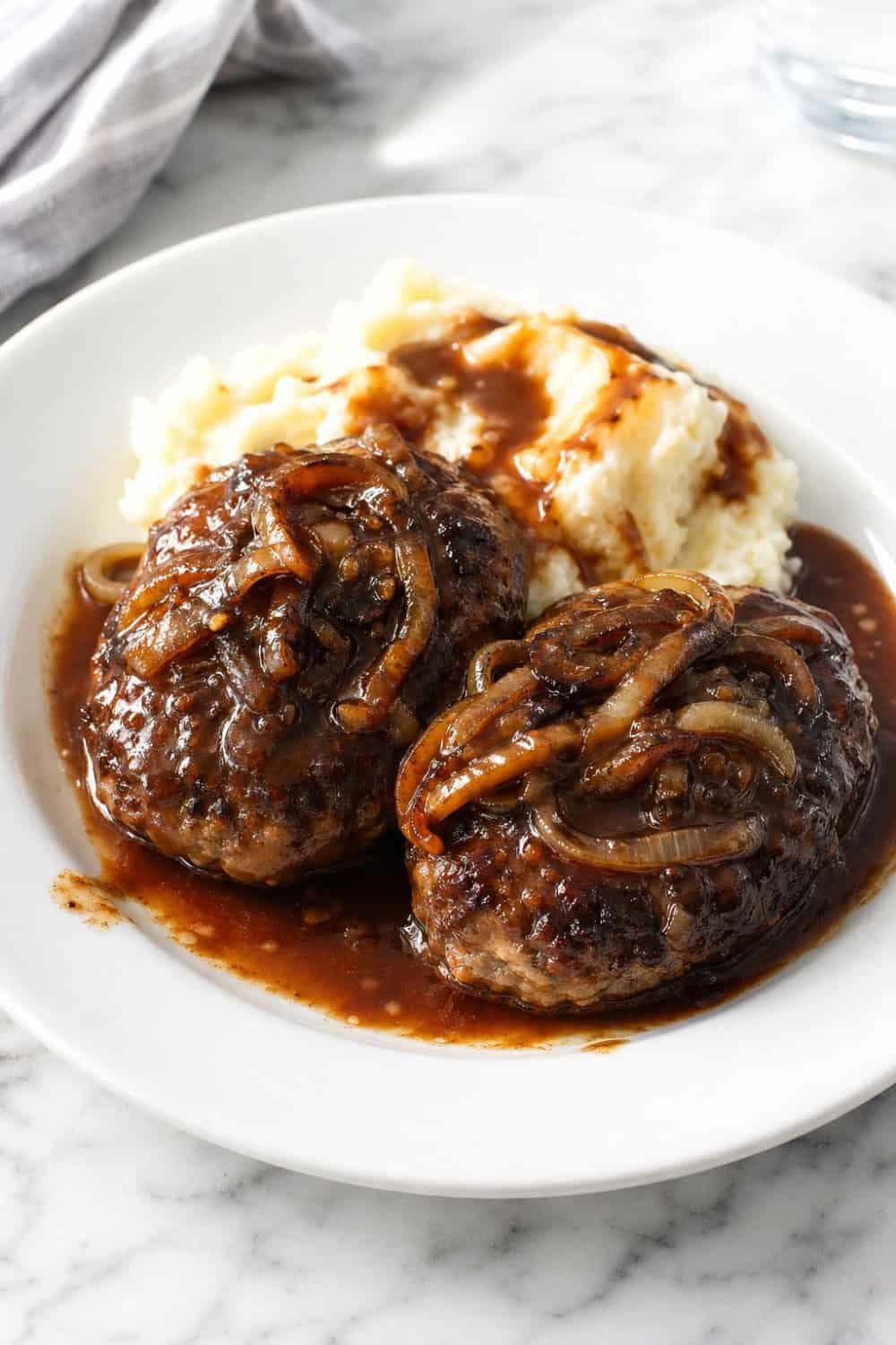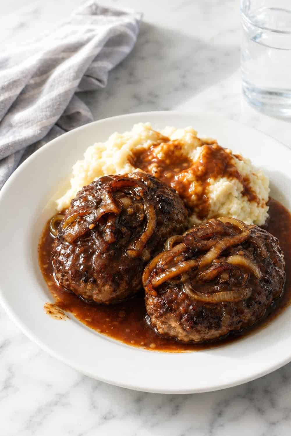 Hamburger steak with onion gravy was practically made to be served over creamy mashed potatoes — the gravy soaks right in and every bite is pure comfort. You can also serve it alongside buttered egg noodles or fluffy white rice if you want something a little different.