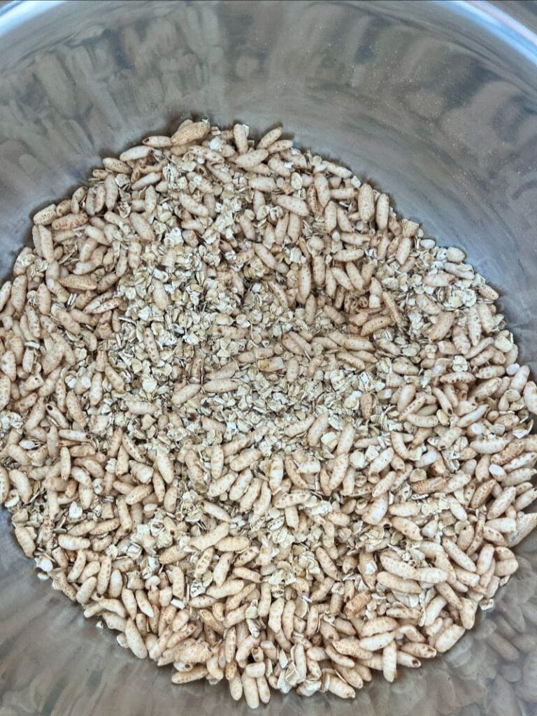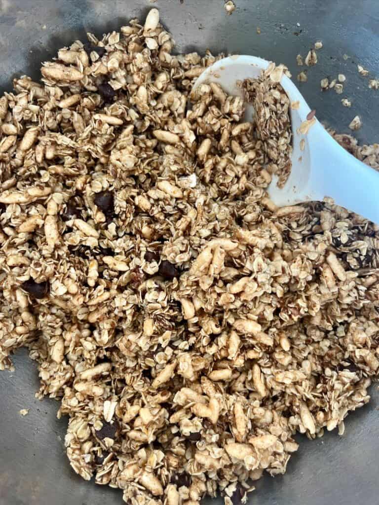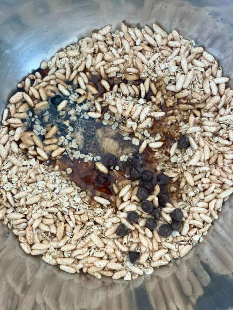 - Mix oats, rice cereal, and flaxseed in a large bowl
