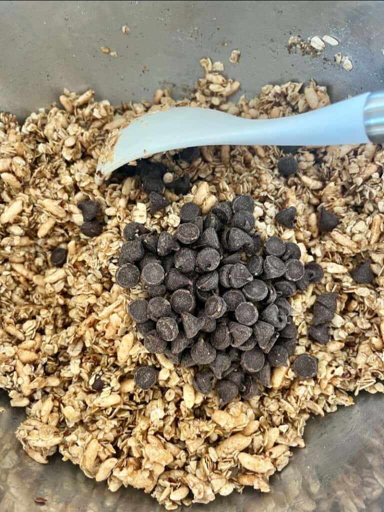 4. Pour syrup over dry ingredients, mixing gently to coat. Fold in chocolate chips.