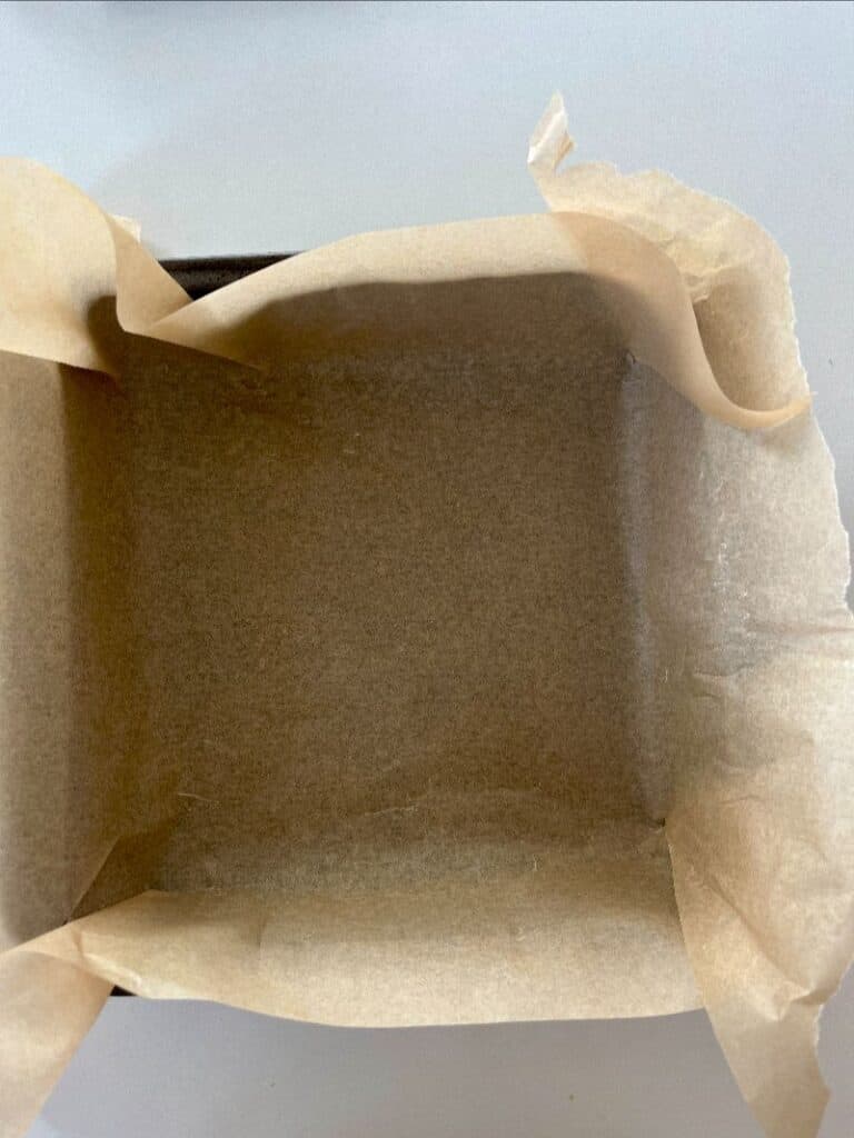 - Line an 8 or 9-inch pan with parchment paper, leaving overhang for easy removal