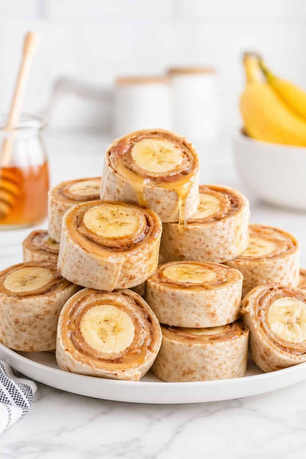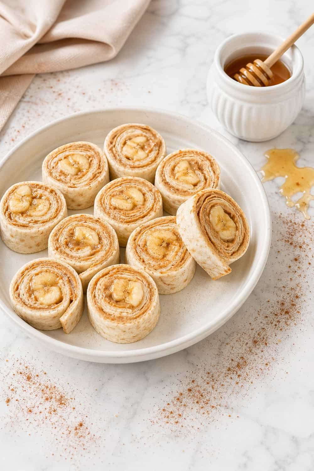 These peanut butter banana roll-ups feel a little indulgent but take almost no effort at all. Creamy peanut butter, naturally sweet banana slices, a drizzle of honey, and a dusting of cinnamon all wrapped up in a soft flour tortilla — it’s a combination that just works.