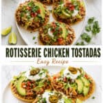 Built on crispy shells loaded with seasoned chicken, creamy refried beans, fresh toppings, and a hit of lime, these Rotisserie Chicken Tostadas are a satisfying mix of texture and bold flavor.