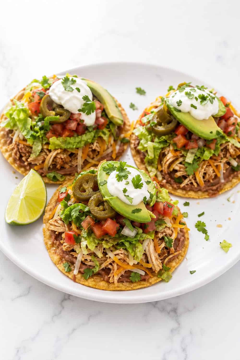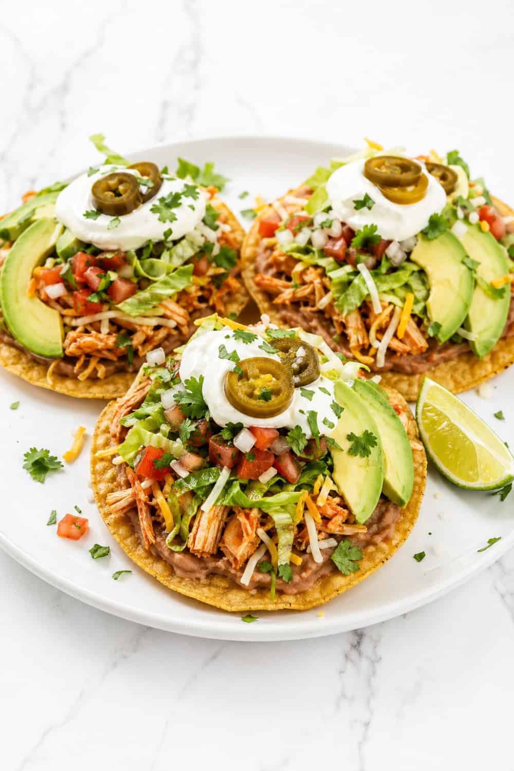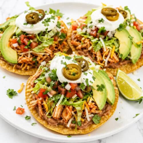 Store all components separately for the best results — assembled tostadas get soggy fast and won’t hold up well. The seasoned chicken keeps in an airtight container in the fridge for up to four days and reheats wonderfully in a skillet over medium heat with a splash of water or chicken broth to keep it moist.