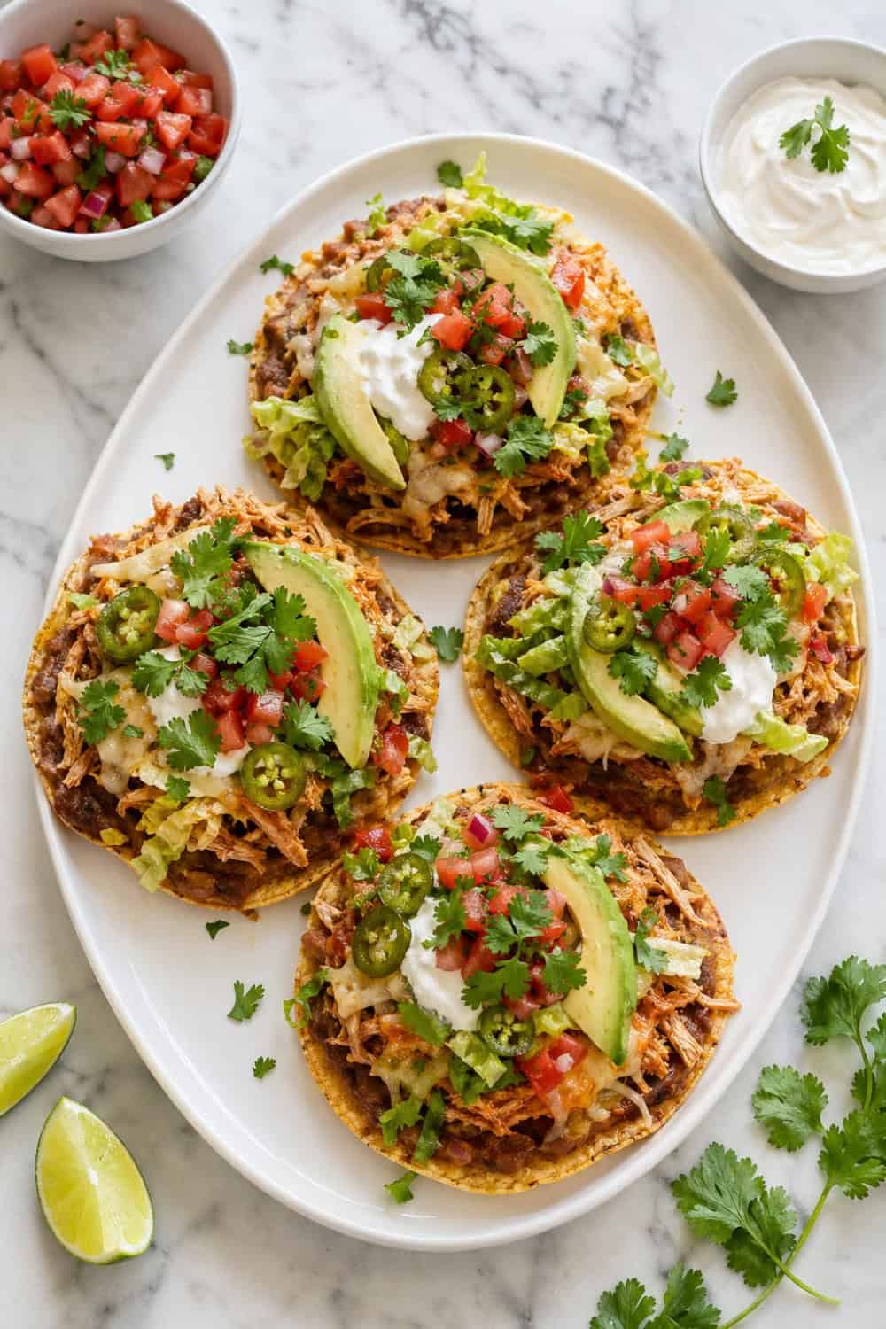 • Add the toppings. Pile on the shredded lettuce, pico de gallo, avocado, jalapeños, and a dollop of sour cream.