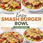 A smash burger bowl takes everything you love about a classic diner-style burger and strips it back to the good stuff — crispy, caramelized beef patties loaded with melted cheese, crunchy pickles, fresh veggies, and a creamy, tangy sauce that ties it all together.