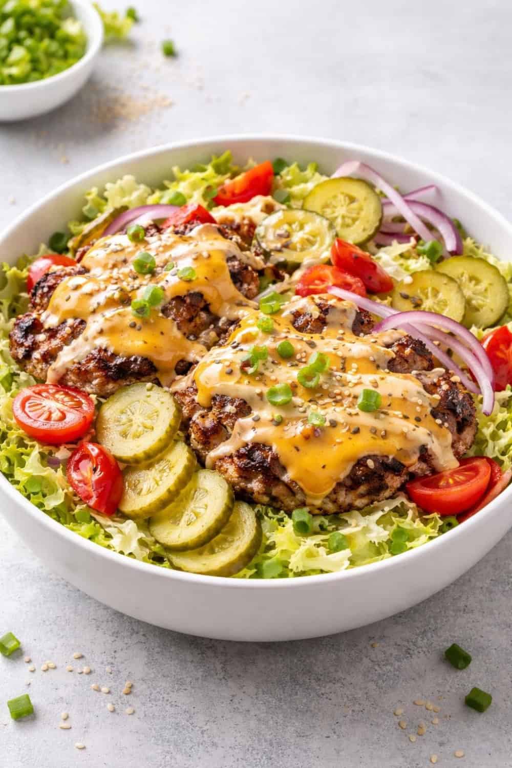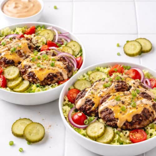 - Assemble the bowls. Layer shredded lettuce in each bowl. Add cherry tomatoes, red onion, and pickles. Stack 2 patties on top of each bowl.