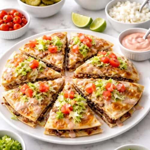 - Slice and serve. Cut each quesadilla into wedges and top with shredded lettuce, diced tomato, and an extra drizzle of special sauce. Dig in immediately!