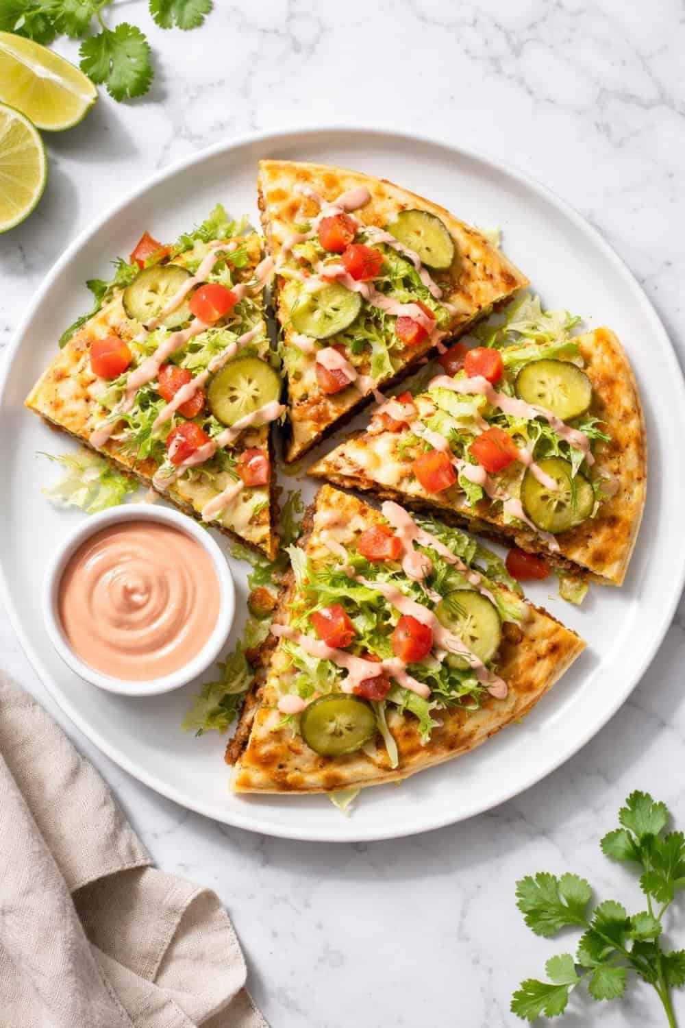 For the tortilla, a larger burrito-size wrap gives you more room to load up each quesadilla. Not a fan of pickles? Pickled jalapeños make a punchy swap that pairs well with the special sauce.