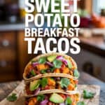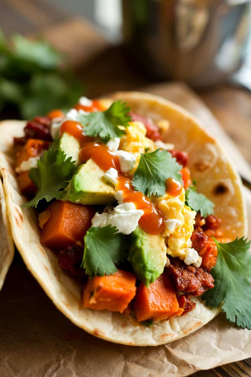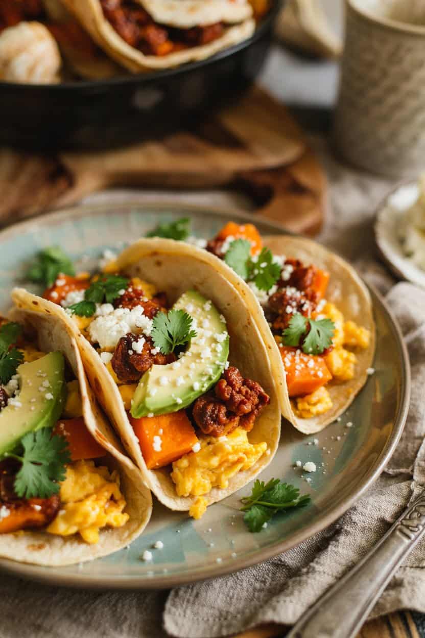 - Assemble your tacos: place a spoonful of the sweet potato and egg mixture on each tortilla, top with chorizo, avocado slices, cotija cheese, cilantro, and hot sauce.